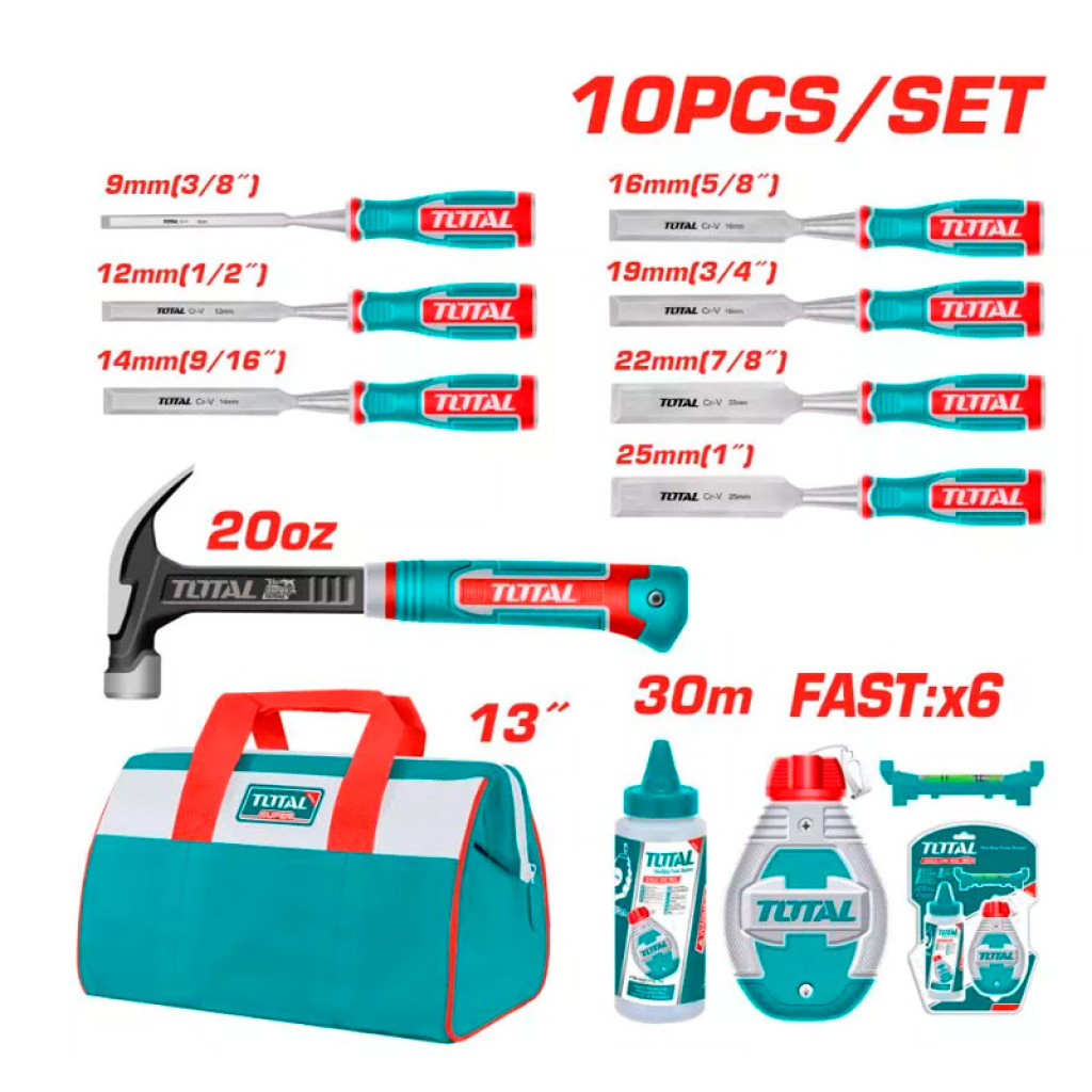Փաթեթում | 1 հատ 20 ունց ճանկով մուրճ (THCH61020L), 1 Կոմպլեկտ fastx6 կավիճով գծման համար (THT666301), 7 հատ փայտե սայր:9,12,14,16,19,22,25 մմ (THT4196,THT41126,THT41146,THT41166,THT41196,THT41226,THT41256), 1 հատ 13"" գործիքների պայուսակ (THT261325) |
