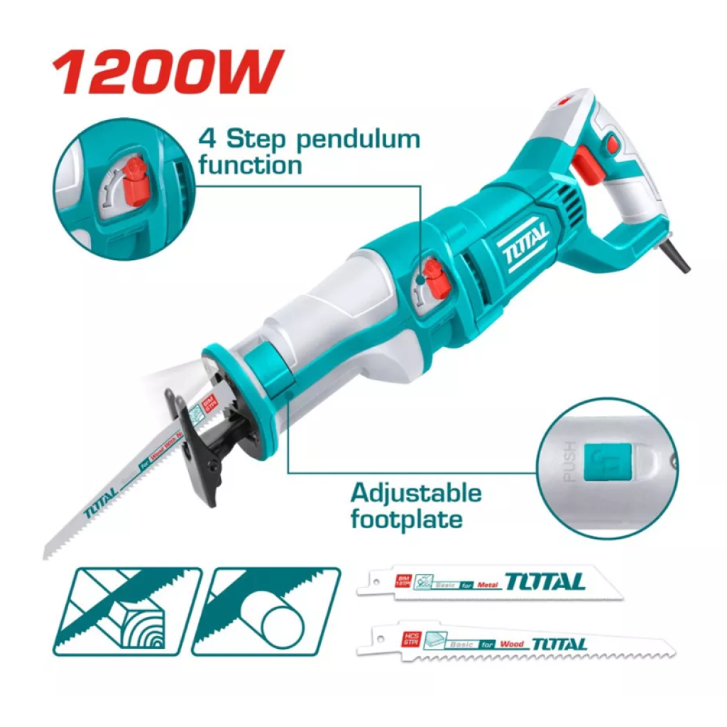 Total TS1001201 մխոցային էլեկտրական սղոցը նախատեսված է տարբեր նյութերի արագ և հարմարավետ կտրելու համար։ Այն լայնորեն օգտագործվում է ինչպես մասնագիտական, այնպես էլ կենցաղային աշխատանքներում։