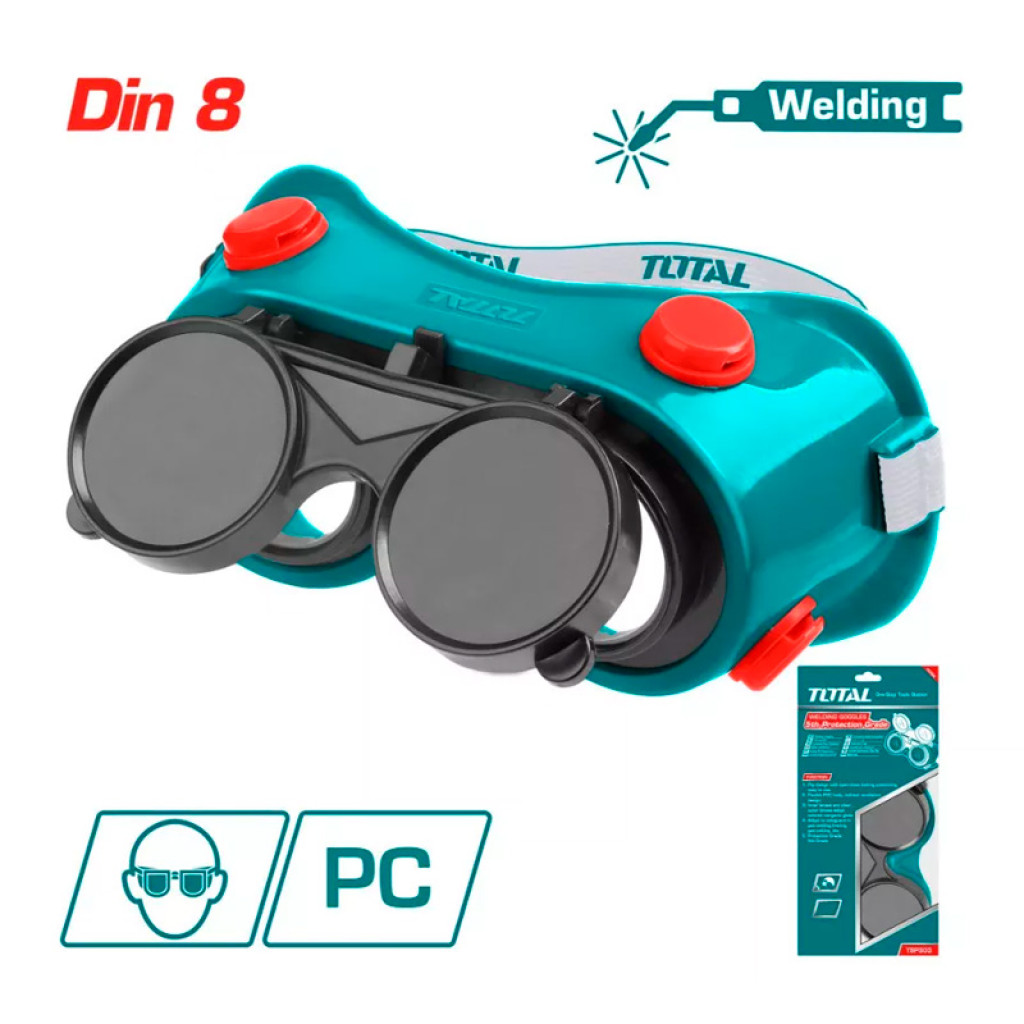 TOTAL TSP303 եռակցման ակնոցները նախատեսված են պաշտպանելու 120 մ / վ արագությամբ թռչող մասնիկներից և ուլտրամանուշակագույն ճառագայթումից : Հագեցած է ներքին թափանցիկ ոսպնյակներով և 5 ստվերային բացվող ֆիլտրերով :