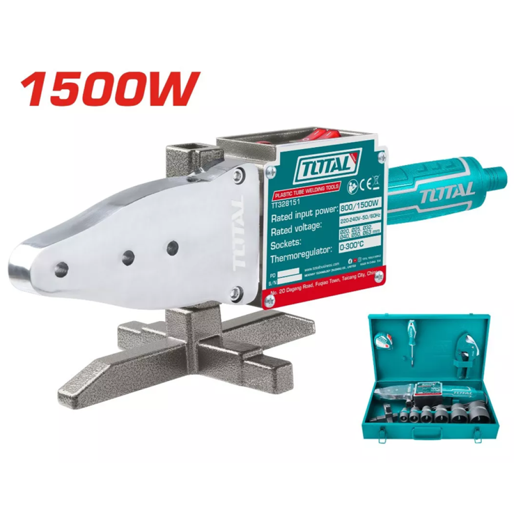 TOTAL TT328151 սարքը լայնորեն կիրառվում է սանտեխնիկական աշխատանքների ոլորտում: Նախատեսված է պոլիպրոպիլենային խողովակների զոդման համար։ Փաթեթում՝ կցորդիչներ (20մմ, 25մմ, 32մմ, 40մմ, 50մմ, 63մմ), չափիչ ժապավեն (3մ), թիթեղի մկրատ, պտուտակահան։