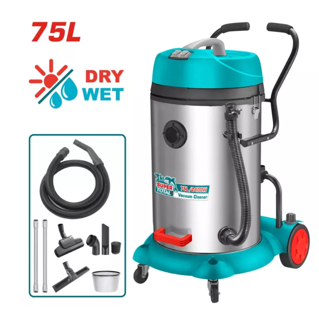 Փոշեկուլը նախատեսված է ինչպես չոր, այնպես էլ խոնավ մաքրման աշխատանքների համար։ Առկա է վարդակ՝ էլեկտրական գործիքների համար։ Փոշեհավաքիչի ծավալը՝ 75լ։ Փաթեթում՝ 5.5մ մալուխ, 1հ․ ճկուն խողովակ, 1հ․ հատակ մաքրող խոզանակ, 1 հատ մետաղական բռնակ, 1 հատ HEPA ֆիլտր (TVCAIHP03)։Փոշեկուլ վակումային TOTAL TVC24751 2400Վտ (ԿՈԴ 13936)