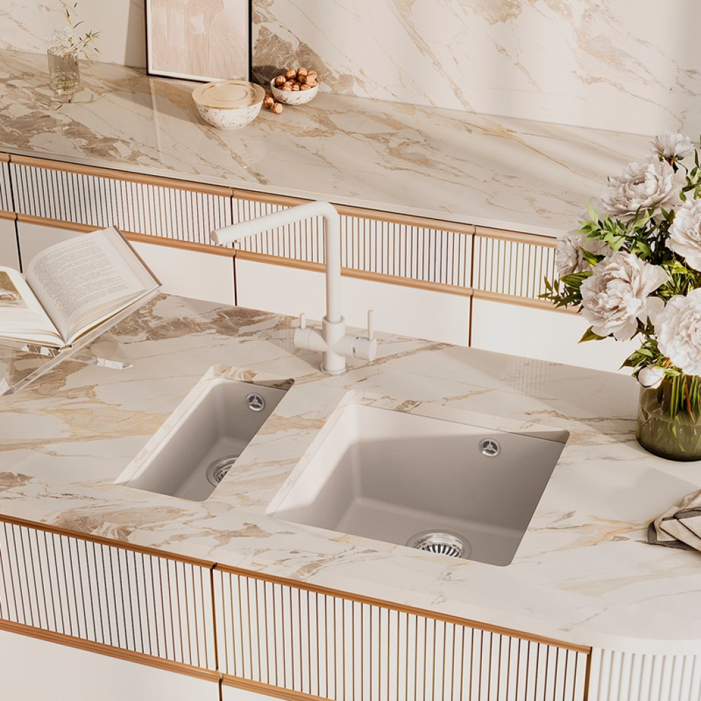 Խոհանոցի լվացարանը պատրաստված է ժամանակակից ավտոմատացված սարքավորումների հիման վրա և կազմված է բարձրորակ քվարցային կոմպոզիտներից: ULGRAN Quartz լվացարանը պատրաստված է քվարցային կոմպոզիտից, որը բաղկացած է՝ ակրիլացված ջերմաակտիվ պոլիեսթեր խեժերից (20%) և պիգմենտային քվարցային ավազից (80%): Քվարցային կոմպոզիտը իսկապես նորարարական լուծում է խոհանոցային լվացարանների արտադրության մեջ, որը դիմադրություն է ապահովում կենցաղային ազդեցություններին, ինչպիսիք են՝ քայքայումը և քերծվածքները: